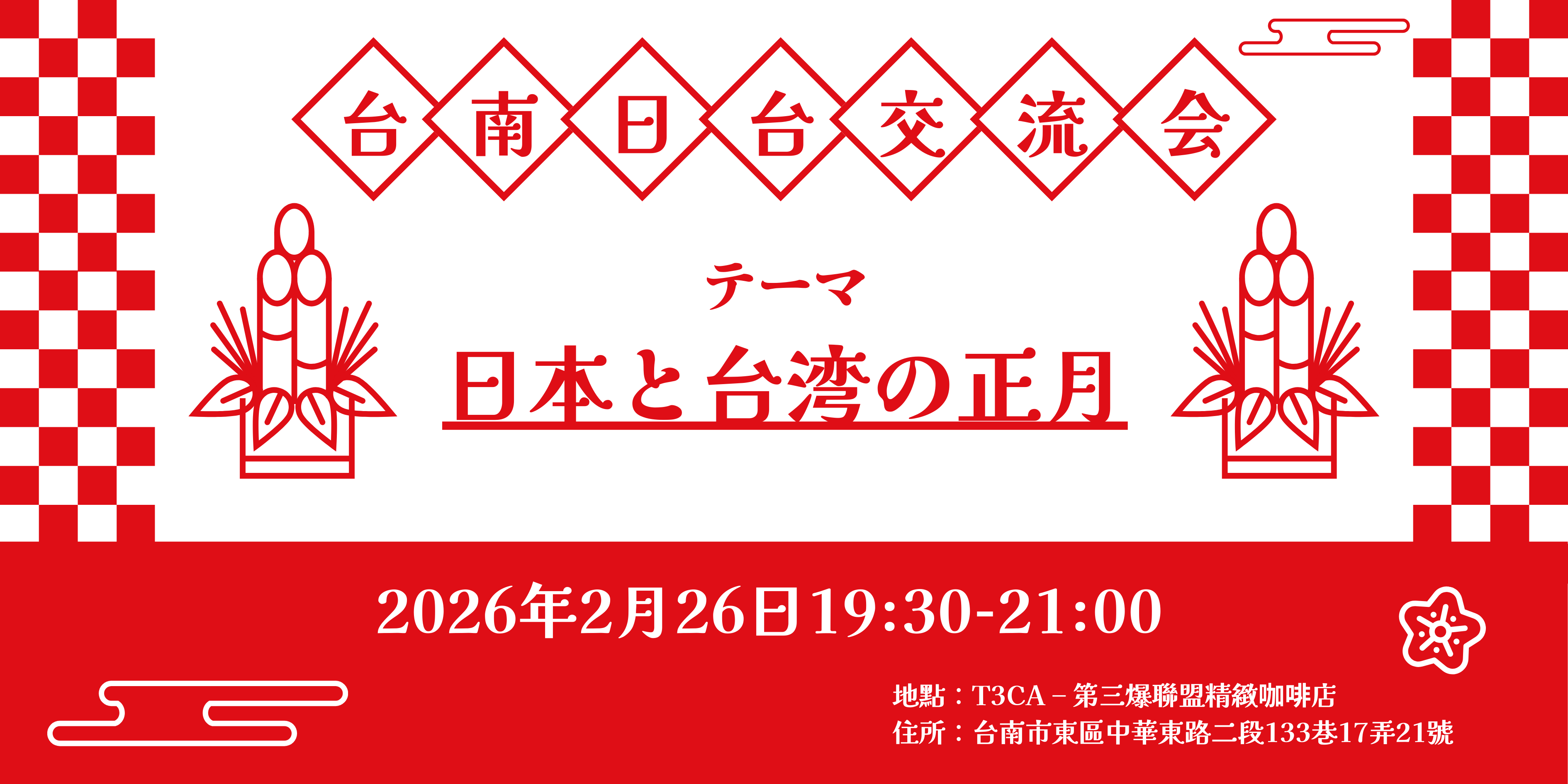這次的主題是「日本與台灣的過年」!日本與台灣在過年的習俗、氣氛以及傳統食物上都有許多不同之處。例如日本的新年料理與初詣,台灣的年夜飯與紅包文化等,都各具特色。歡迎大家分享自己童年時的過年回憶,以及和家人一起度過新年的方式。透過交流彼此的差異與共通點,一起更深入認識兩地的文化吧!