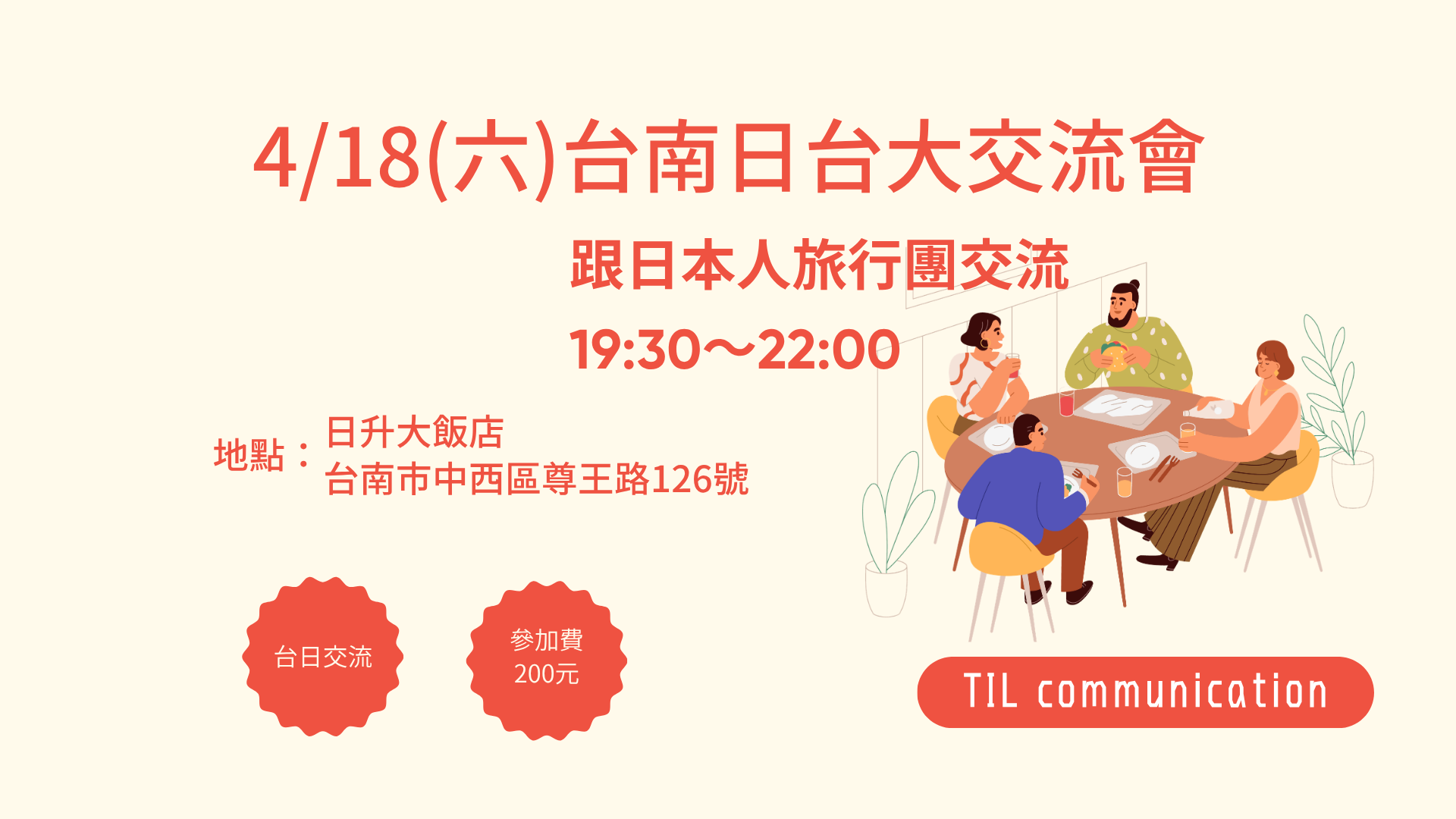 活動地點為日升大飯店,限額20名,額滿為止。有興趣的朋友請盡早報名,把握與日本朋友近距離交流的好機會!